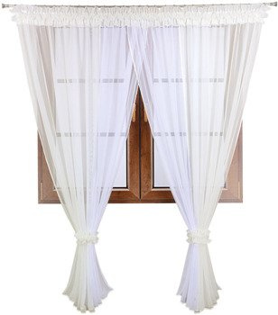 Wiązana firana duo biała z woalu ozdobiona gipiurą Cudka