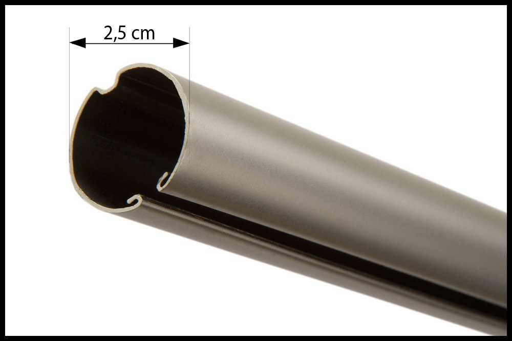 - Solidna metalowa szyna o średnicy 25 mm została pokryta powłoką galwaniczną oraz warstwą lakieru, która zwiększa odporność na ścieranie.