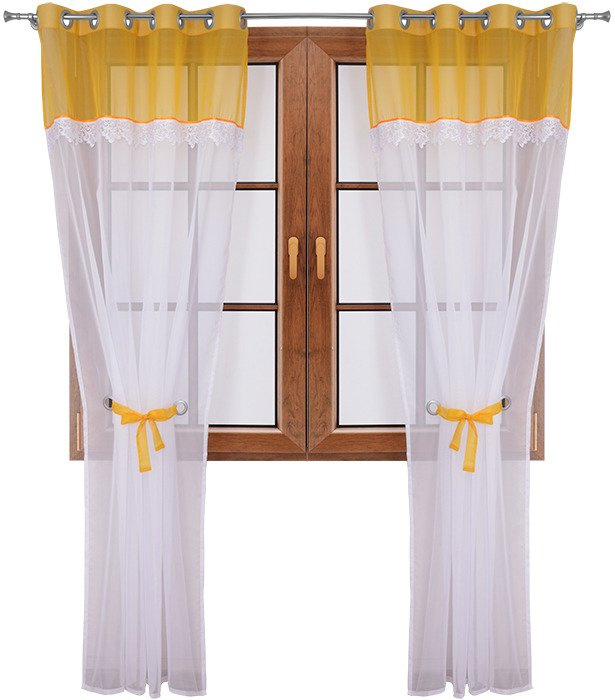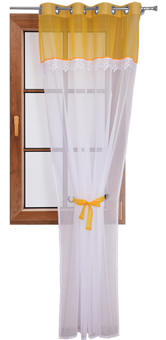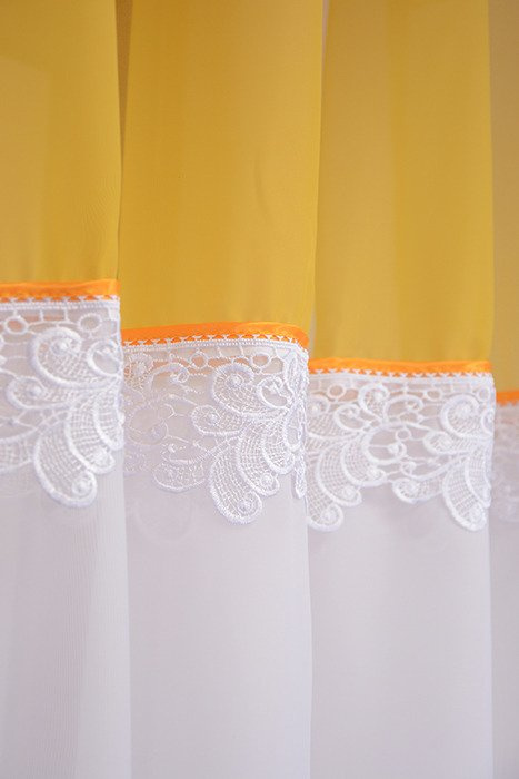 Wiązana firana duo żółta z woalu ozdobiona gipiurą Cudka