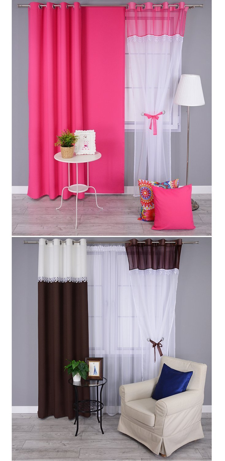 Urocza firana jest uszyta z wysokiej jakości białego woalu, górna część wykonana jest z woalu kolorowego. Połączenie tkanin wykończone jest ozdobną białą gipiurą. Pośrodku firany znajdują się dwie srebrne przelotki, dzięki którym można ją efektownie spiąć dołączoną taśma z woalu. Pięknie układająca się firana stworzy niepowtarzalny klimat w każdym wnętrzu zarówno klasycznym, nowoczesnym jak i glamour. Firana jest niezwykle elegancka, idealna do salonu, kuchni, sypialni czy pokoju dziecka - wszędzie będzie wyglądać olśniewająco i nadawać blasku Twojemu domowi.
