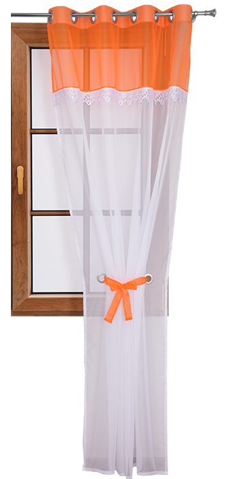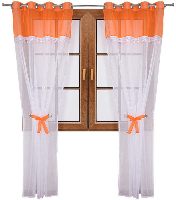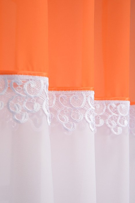 Wiązana firana duo pomarańczowa z woalu ozdobiona gipiurą Cudka