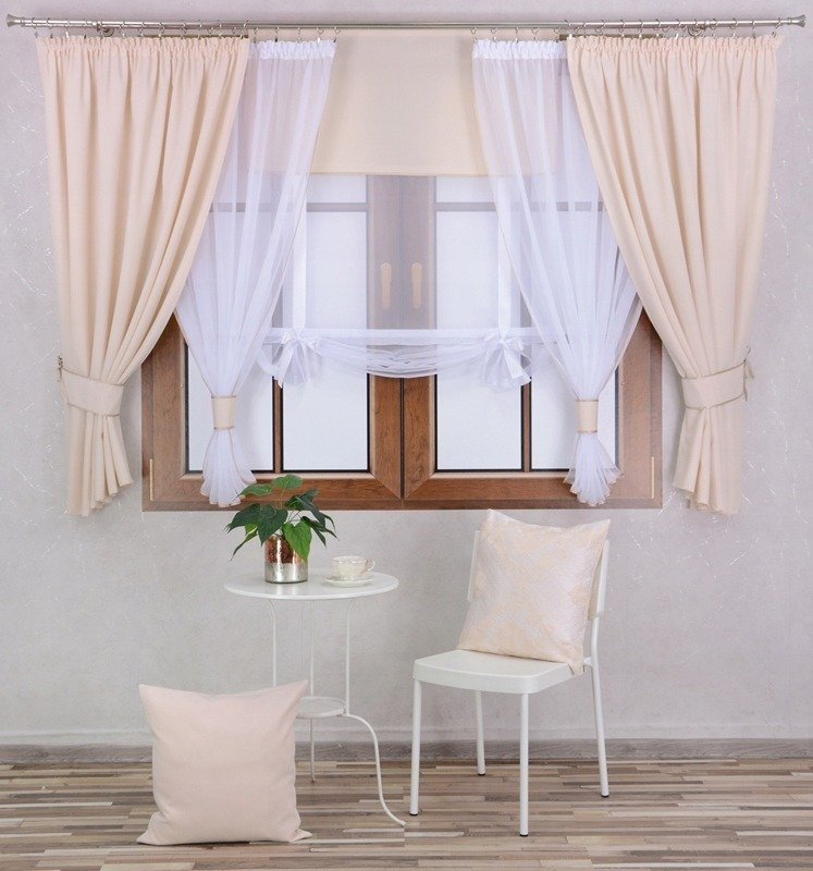 Pięknie układający się komplet stworzy niepowtarzalny klimat w każdym wnętrzu zarówno w stylu klasycznym, nowoczesnym jak i glamour. Wyjątkowa firana jest uszyta z wysokiej jakości białego woalu, brzegi zostały wykończone atłasowa lamówką, charakteru nadaje dekoracyjna podwiązka. Panel jest uszyty z białego woalu oraz jednokolorowego matowego materiału o gęstej strukturze. Ozdobiony jest dwoma satynowymi tasiemkami, które tworzą urocze kokardki, można nimi również regulować wysokość panelu. Do każdego panelu dołączamy obciążnik (gratis!), dzięki któremu doskonale się układa. Komplet jest niezwykle uroczy, idealny do salonu, sypialni, kuchni czy pokoju dziecka - wszędzie będzie wyglądać olśniewająco i nadawać blasku Twojemu domowi.
