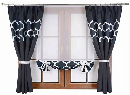 Pięknie układający się komplet: zasłony oraz panel nadadzą niepowtarzalny klimat każdemu wnętrzu. Zasłony są uszyte z wysokiej jakości gładkiego matowego materiału oraz materiału z nadrukiem na wierzchniej stronie. Uroku dodają dwie satynowe podwiązki dołączane do zasłon. Panel wykonany został z wysokiej jakości białego woalu, wykończony tkaniną z nadrukiem. Satynowe tasiemki do podwiązania tworzą urocze kokardki. Do panelu dołączamy obciążnik (gratis!), dzięki któremu doskonale się układa. Komplet jest elegancki, idealny do salonu, sypialni czy pokoju dziecka - wszędzie będzie wyglądać olśniewająco i nadawać blasku Twojemu domowi