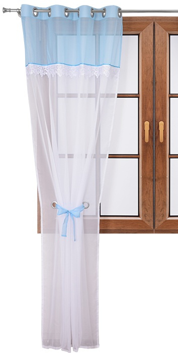 Wiązana firana duo błękitna z woalu ozdobiona gipiurą Cudka Sale S11