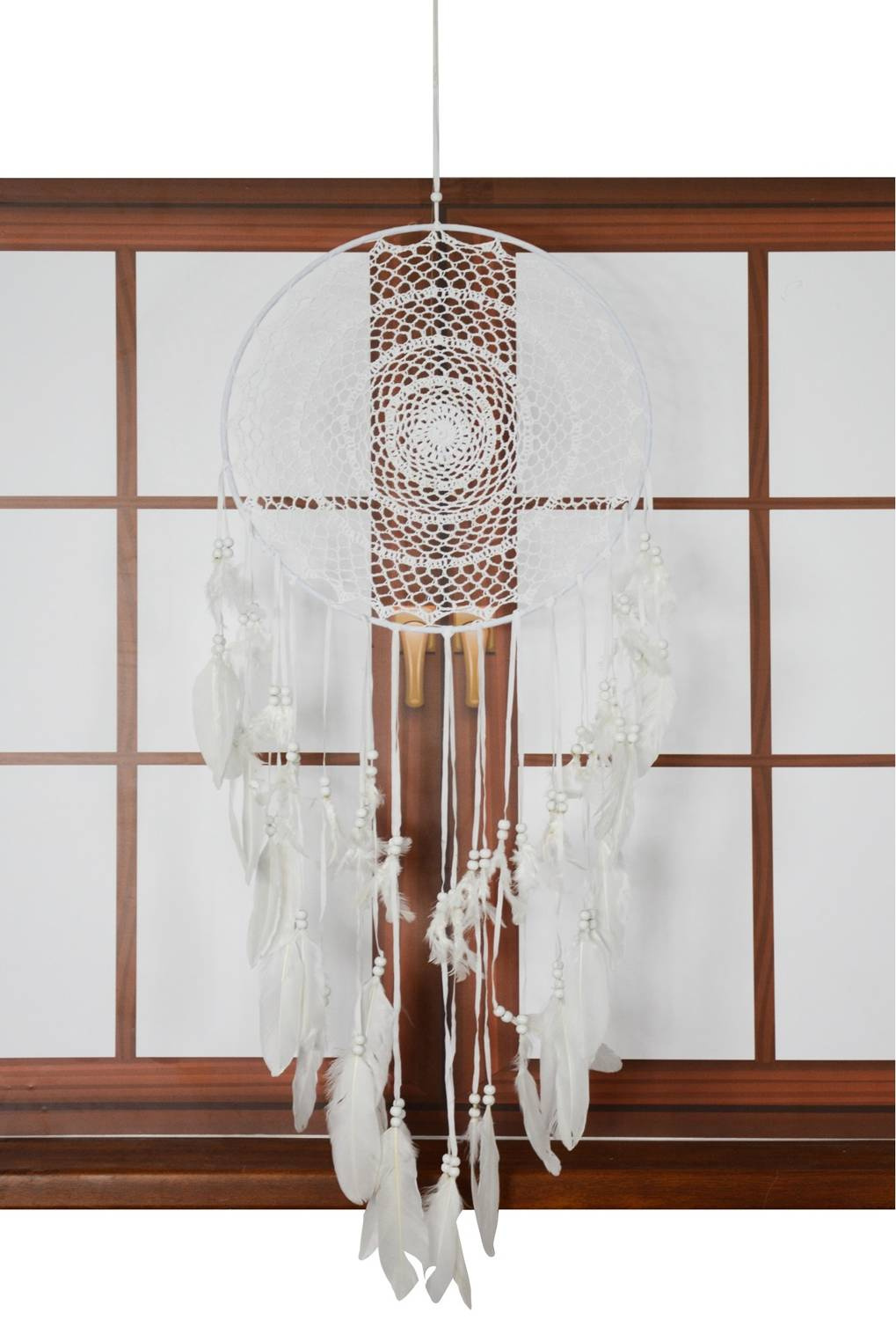 Piękny, ręcznie wykonany łapacz snów, może stanowić główny element dekoracyjny wnętrza, jak również być jego subtelnym dopełnieniem. Ozdobiony jest białymi piórami oraz koralikami. łapacze snów pochodzą z indiańskich wierzeń, nadają oryginalności i powiewu magicznej atmosfery, co sprawia że idealnie wpasują się w każdą przestrzeń bez względu na jej styl czy przeznaczenie.  Swym nietuzinkowym wyglądem podkreślą wnętrze każdego stylowego pomieszczenia, tworząc przy tym subtelny, elegancki wystrój. Idealny do ozdoby domu. Można go wieszać na ścianie, nad łóżkiem lub w oknie.