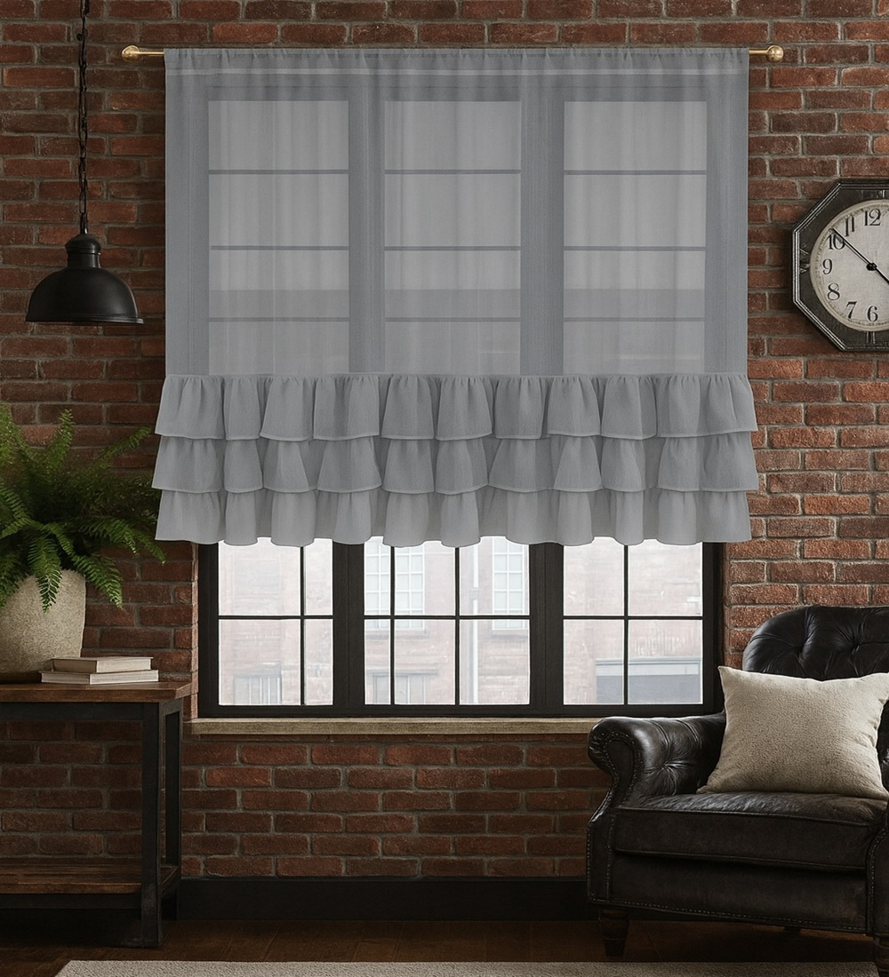 Śliczna firana szara z woalu Carmen II wykończona uroczymi falbanami