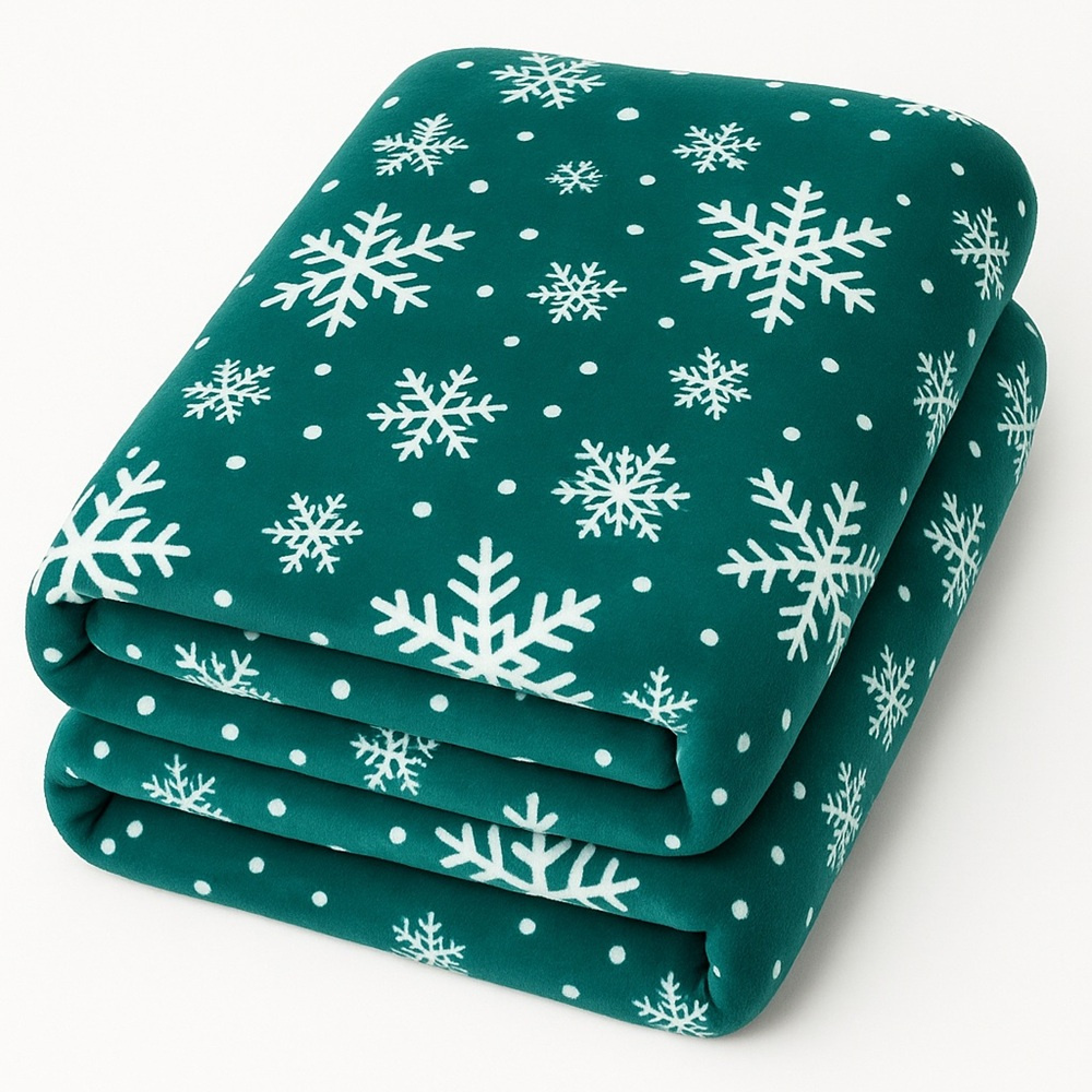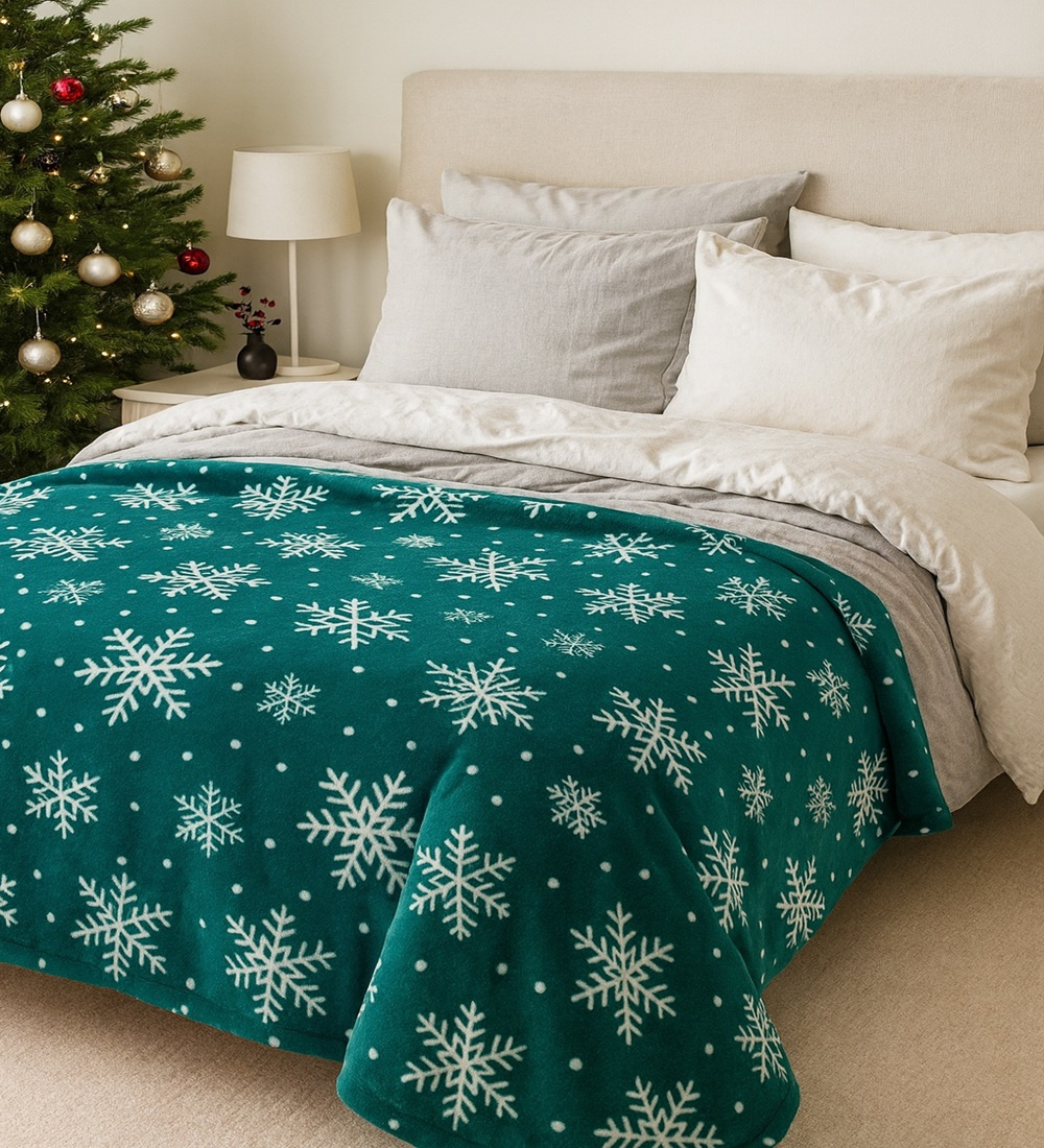 Koc świateczny narzuta pled butelkowa zieleń na łóżko miękki w śnieżynki