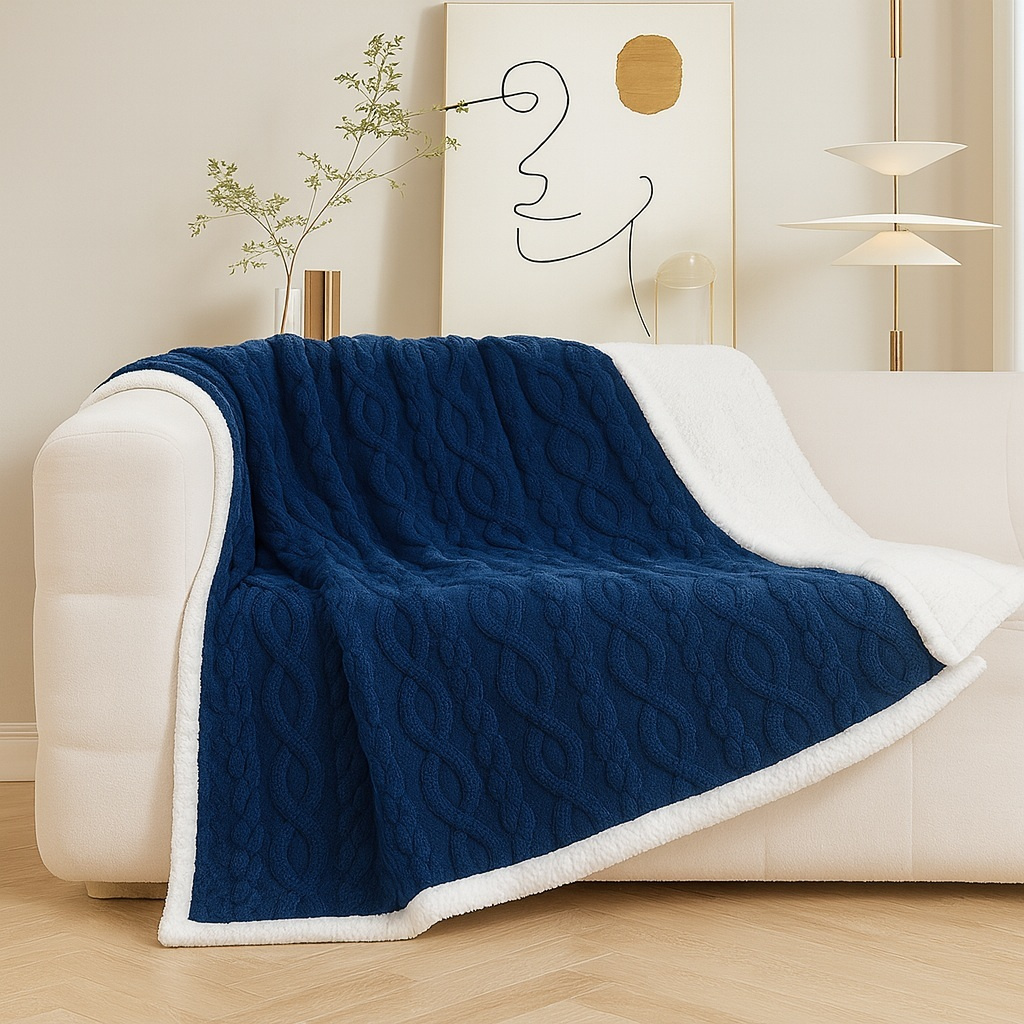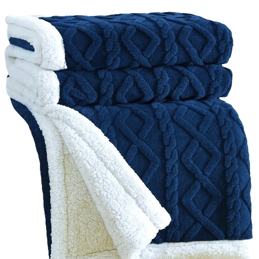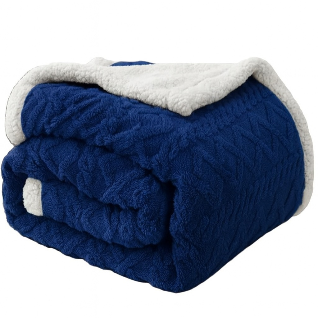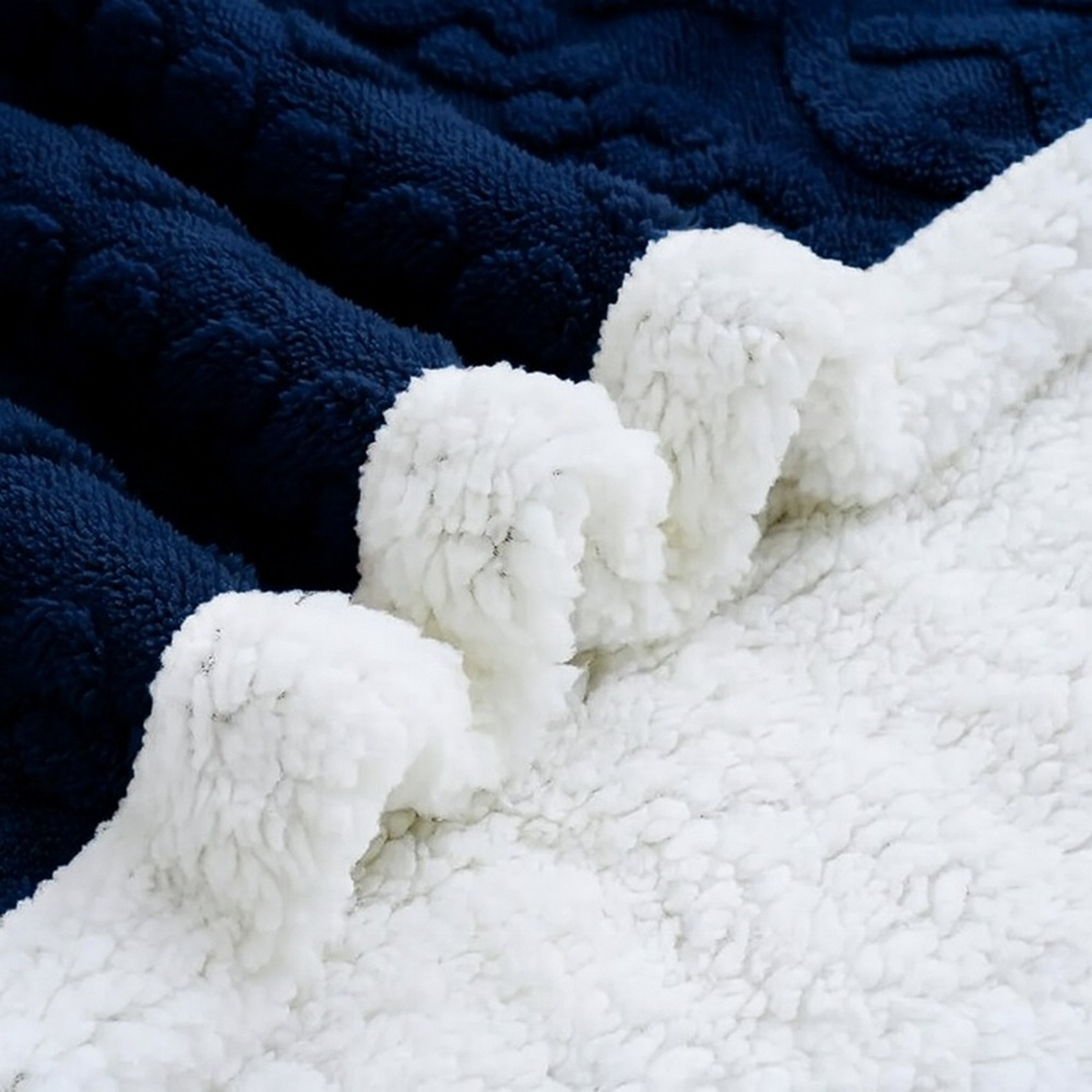 Gruby koc z barankiem narzuta pled ciepły dwustronny wytłaczany granatowy