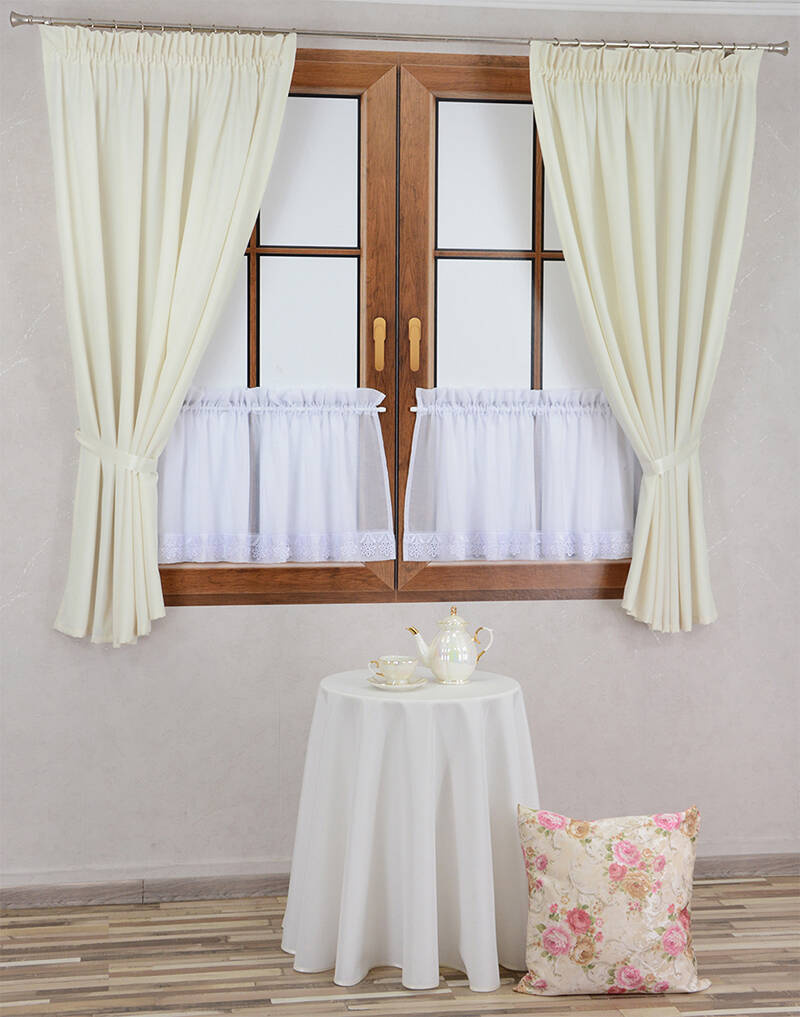 Wyjątkowa zazdrostka nada niepowtarzalny klimat każdemu wnętrzu. Zazdrostka jest uszyta z doskonałej jakości białego woalu, wykończona ozdobną gipiurą. Doskonale sprawdzi się również jako lambrekin. Swym stylowym wyglądem podkreśli wnętrze każdego nowoczesnego pomieszczenia, tworząc przy tym subtelny, elegancki wystrój. Jest to idealna propozycja do okien w kuchni. Z powodzeniem sprawdzi się w klasycznym jak i nowoczesnym wnętrzu. Dzięki swej strukturze doskonale ozdobi okno dodając wnętrzu niebywałej elegancji. Dodadzą blasku i odmienią mieszkanie.