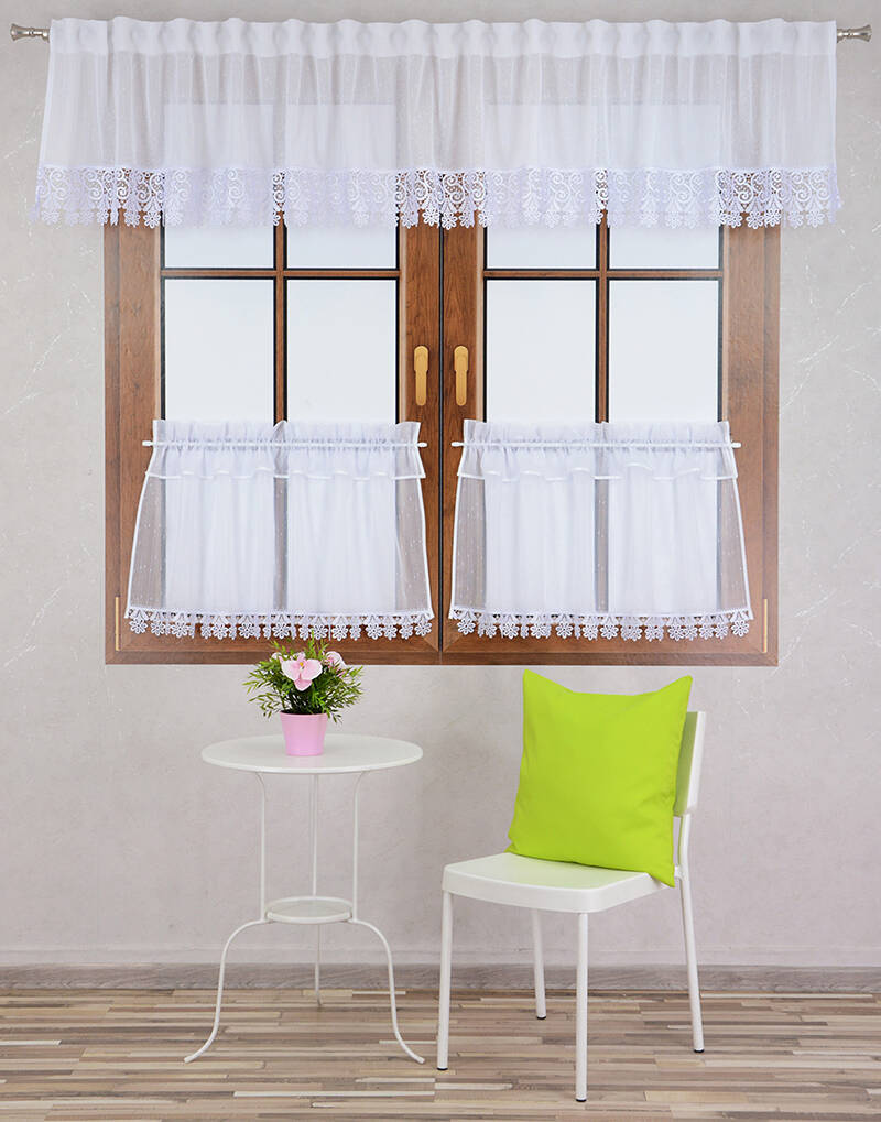 Wyjątkowa zazdrostka nada niepowtarzalny klimat każdemu wnętrzu. Zazdrostka jest uszyta z doskonałej jakości białego woalu deszczyk, wykończona ozdobną gipiurą. Doskonale sprawdzi się również jako lambrekin. Swym stylowym wyglądem podkreśli wnętrze każdego nowoczesnego pomieszczenia, tworząc przy tym subtelny, elegancki wystrój. Jest to idealna propozycja do okien w kuchni. Z powodzeniem sprawdzi się w klasycznym jak i nowoczesnym wnętrzu. Dzięki swej strukturze doskonale ozdobi okno dodając wnętrzu niebywałej elegancji. Dodadzą blasku i odmienią mieszkanie.