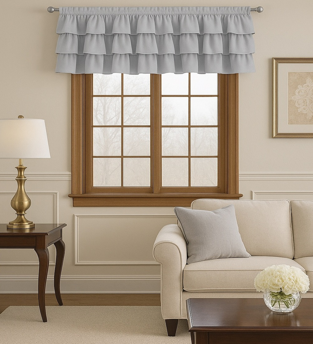 Lambrekin firana z szarego woalu Carmen IV wykończona uroczymi falbanami