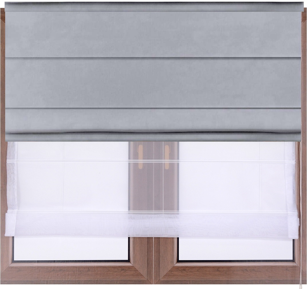 Roleta rzymska DUO z aksamitnego weluru jasno szara i białego woalu łańcuszek