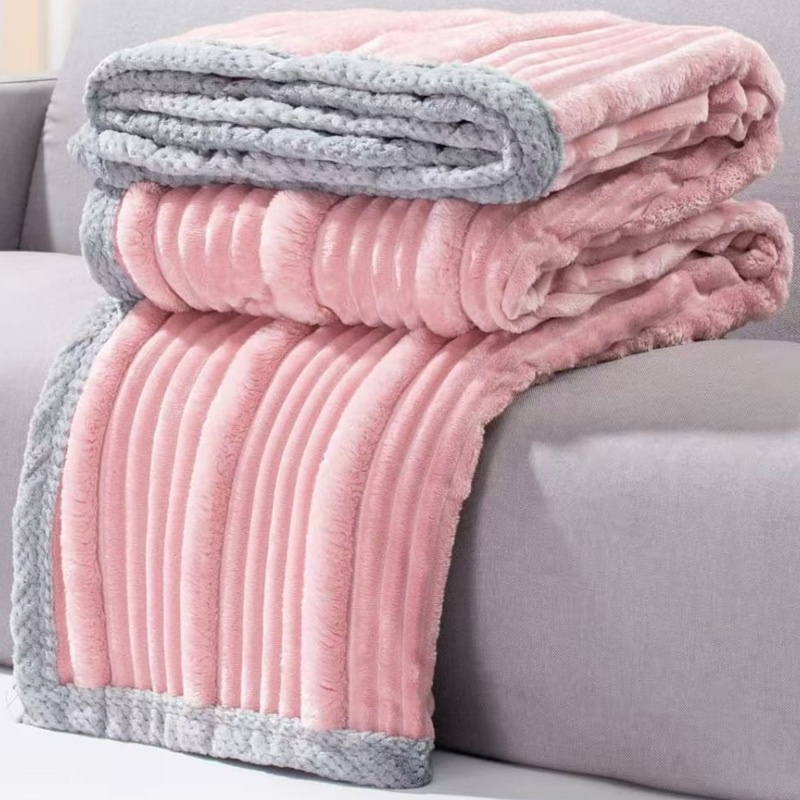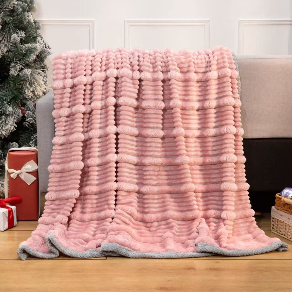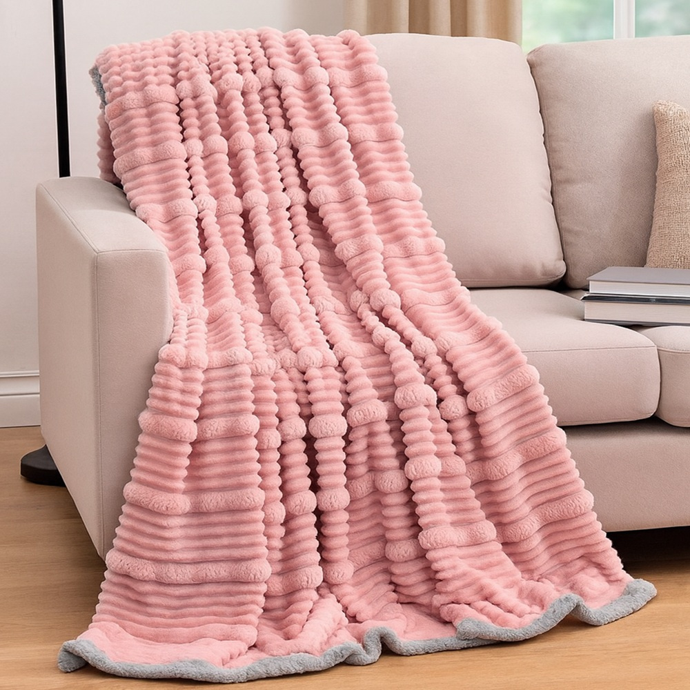 Koc dekoracyjny w prążki narzuta pled na kanapę i łóżko ciepły miękki jasny różowy