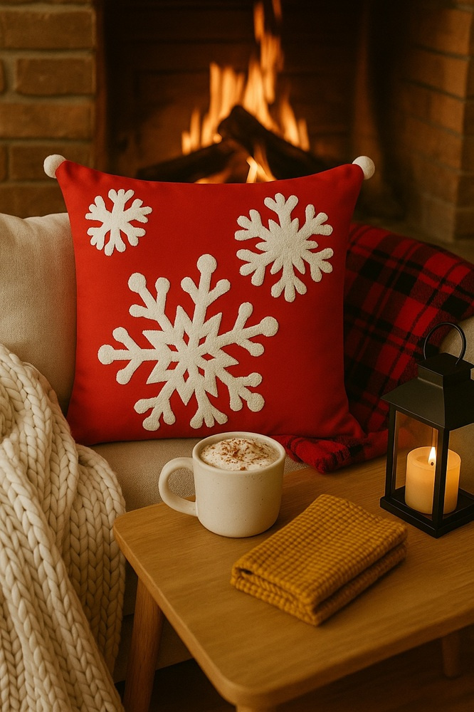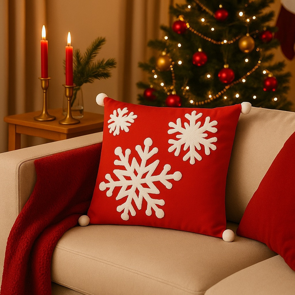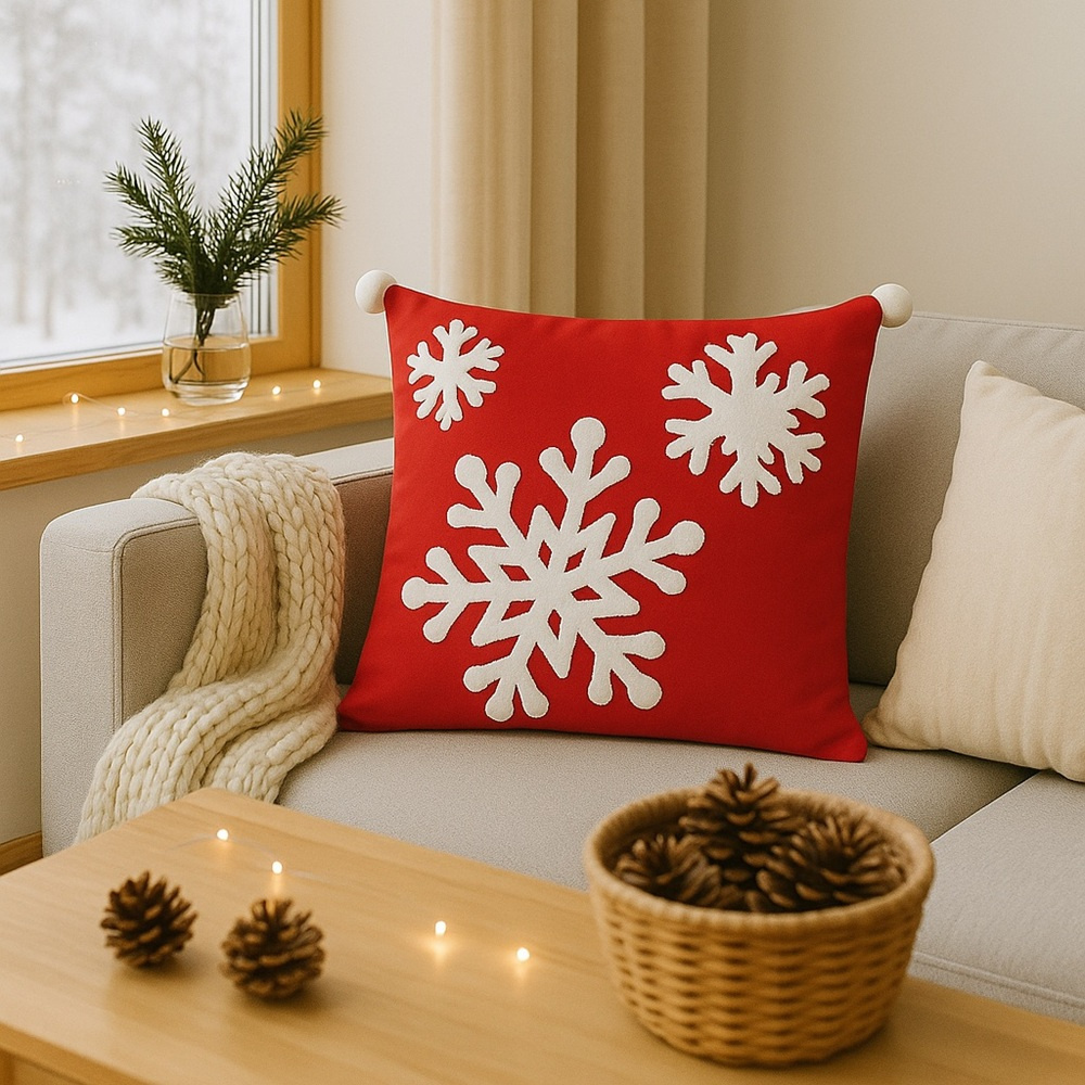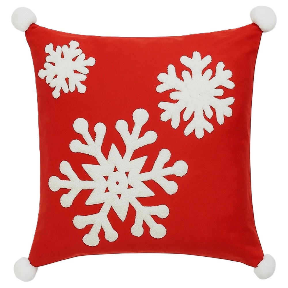 Poszewka świąteczna czerwona z wypukłymi śnieżynkami i pomponami