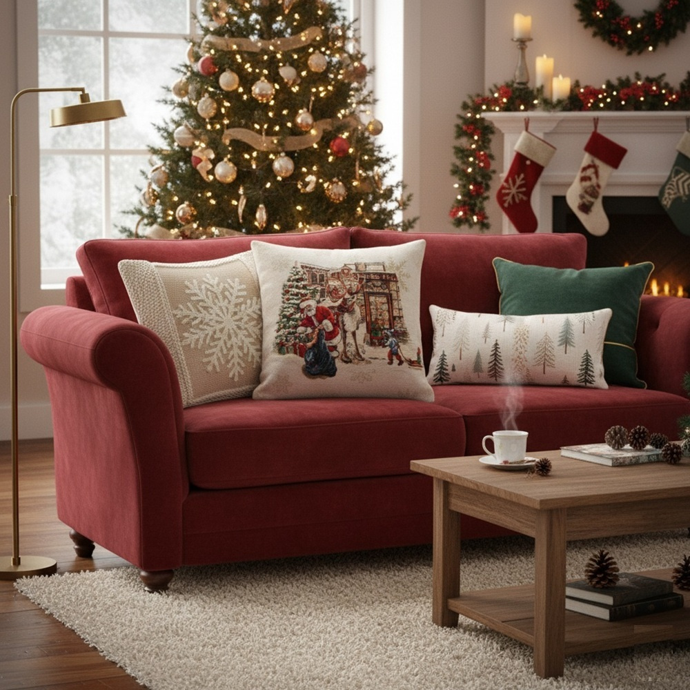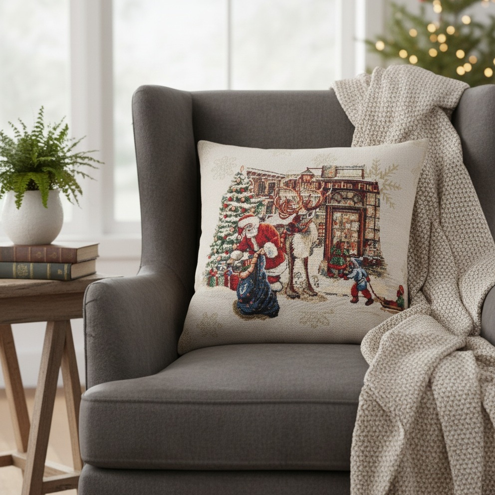 Świąteczna poszewka gobelinowa z Mikołajem, reniferem i choinką to elegancka dekoracja, która wprowadzi do Twojego domu prawdziwy, ciepły klimat Bożego Narodzenia. Wykonana z wysokiej jakości, grubej tkaniny gobelinowej zachwyca trwałością, wyrazistymi kolorami i pięknym, klasycznym wzorem. Motyw tkanej sceny z Mikołajem, reniferem i choinką zachwyca starannymi detalami oraz subtelnymi, błyszczącymi akcentami, które dodają jej elegancji. Poszewka świetnie sprawdzi się jako dodatek do salonu, sypialni czy pokoju dziecięcego – wystarczy położyć ją na sofie lub fotelu, aby wnętrze nabrało ciepłego, bożonarodzeniowego klimatu. Doskonale komponuje się z innymi tekstylnymi dekoracjami świątecznymi, tworząc harmonijną aranżację. To idealny wybór dla osób, które kochają tradycyjne świąteczne motywy i szukają trwałych, efektownych ozdób na lata. Idealna do stylu tradycyjnego, rustykalnego. Świetny pomysł, aby szybko odmienić wnętrze i stworzyć przytulną atmosferę podczas zimowych wieczorów