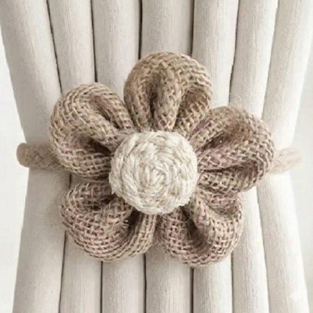 Śliczne klamry kwiaty w stylu boho stworzą niepowtarzalny klimat w każdym wnętrzu, zarówno rustykalnym, klasycznym, nowoczesnym jak i glamour. Wykonane są z wyjatkowej tkaniny będącej połączeniem bawełny oraz juty. Posiadają efektowne zakończenie na końcach plecionego sznurka w postaci eleganckich perełek. Swym naturalnym wyglądem podkreślą wnętrze każdego stylowego pomieszczenia, tworząc przy tym subtelny, elegancki wystrój. Idealne do salonu, kuchni, sypialni czy pokoju dziecka - wszędzie będą wyglądać olśniewająco i nadawać blasku Twojemu domowi.