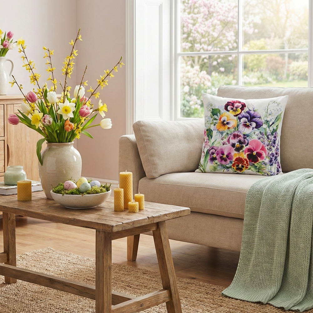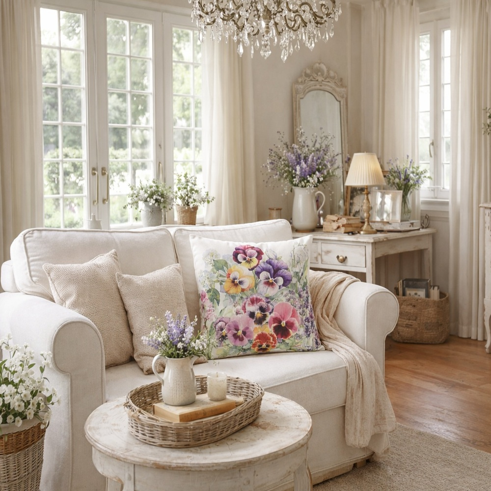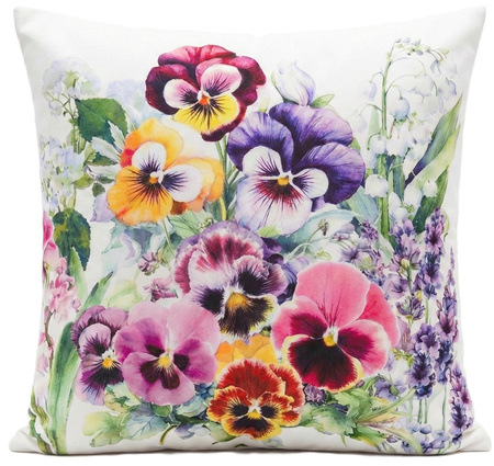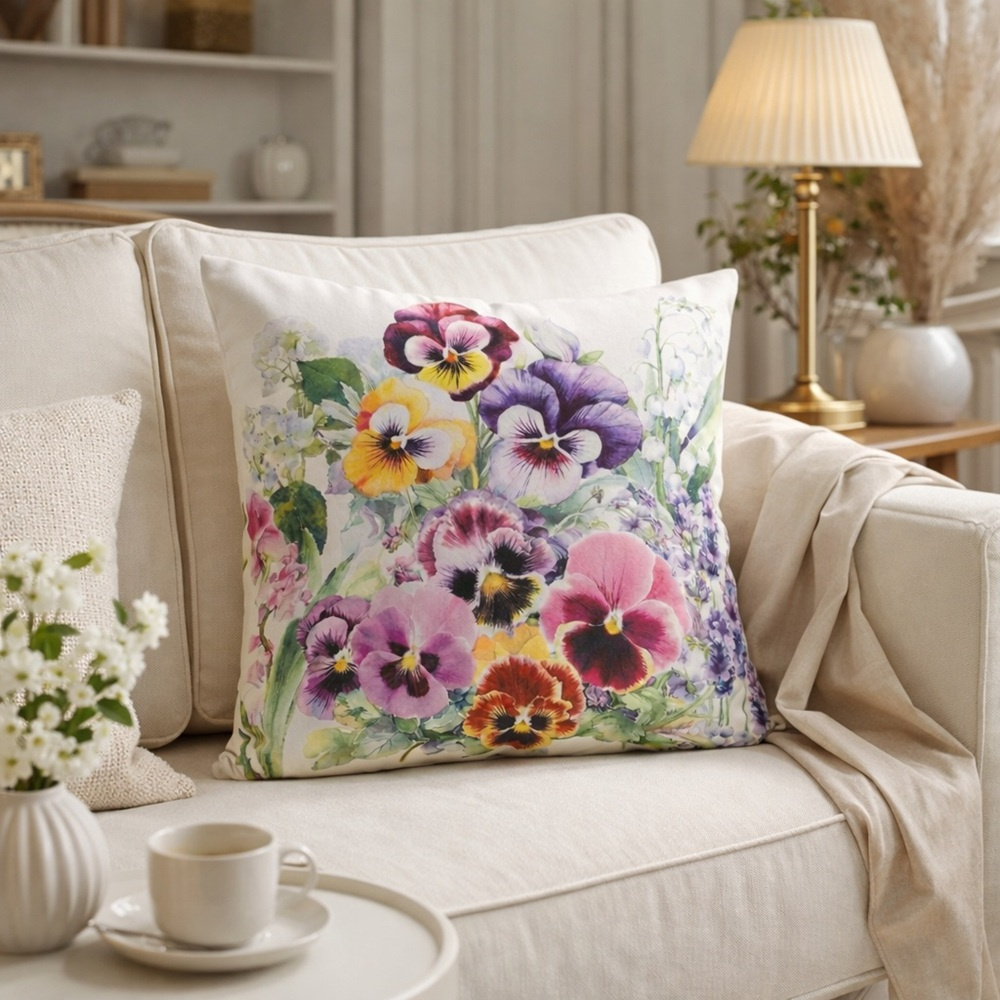 Dekoracyjna poszewka z motywem malarskich bratków to wyjątkowy dodatek, który wnosi do wnętrza świeżość i naturalną elegancję.