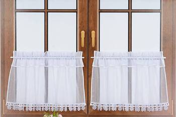 ( ilość produktów: 21 )Firana biała z falbaną z woalu kresz ozdobiona gipiurą Alice II